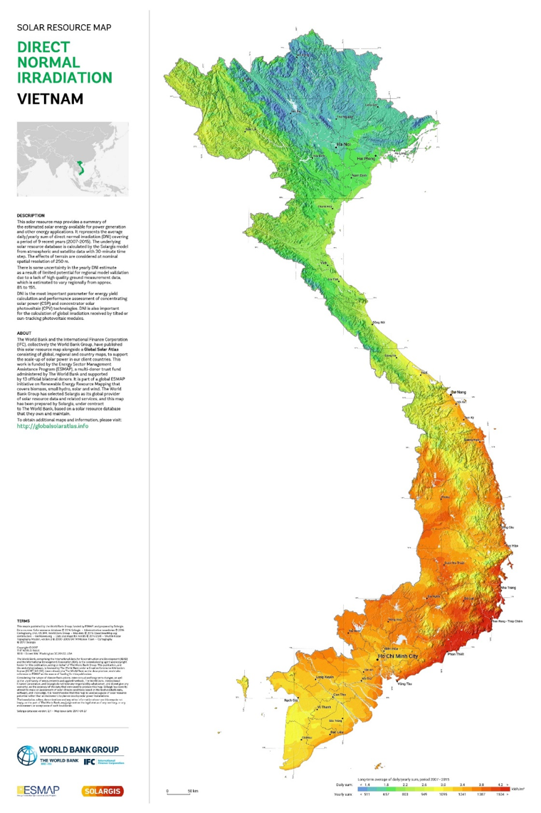 Vietnam and World Bank has signed off a contract for investigation, consulting and implement Solar Power Master Plant for whole country and found that Vietnam is highly solar power source, especially in some province in Southern (See below direct irradiation map from World Bank Project).